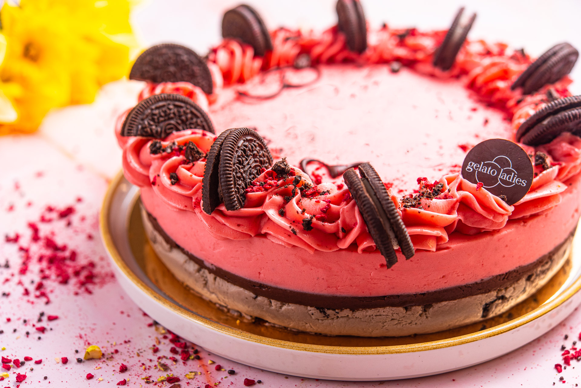 Kaks kihti gelatot: maasika-vaarika sorbett ja oreo küpsistega koorejäätis. See tort ühendab meie väikeste klientide lemmikmaitsed. Soovi korral saame kirjutada tordile peale nime.